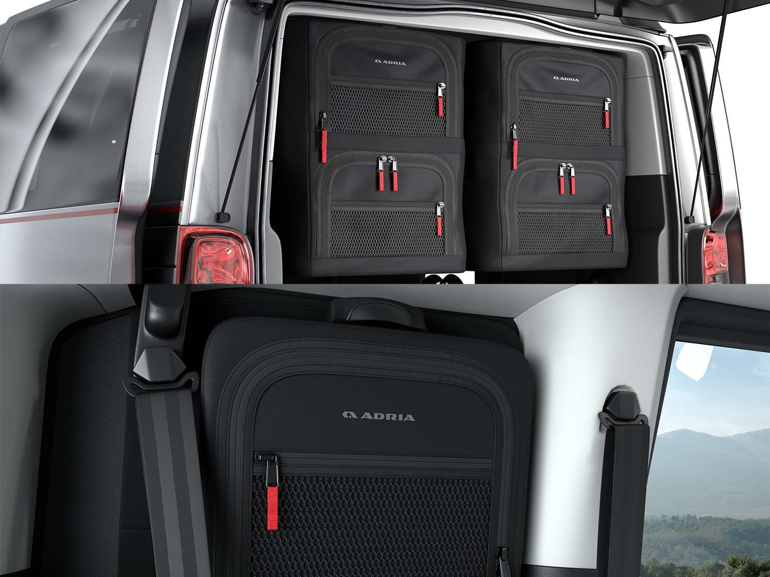 Il set di borse da viaggio in tessuto comprende due borse grandi, con tasche esterne aggiuntive con cerniera (punti di attacco sotto il tetto nella parte posteriore del tettuccio apribile) e due borse medie (per il posizionamento nei finestrini laterali posteriori).