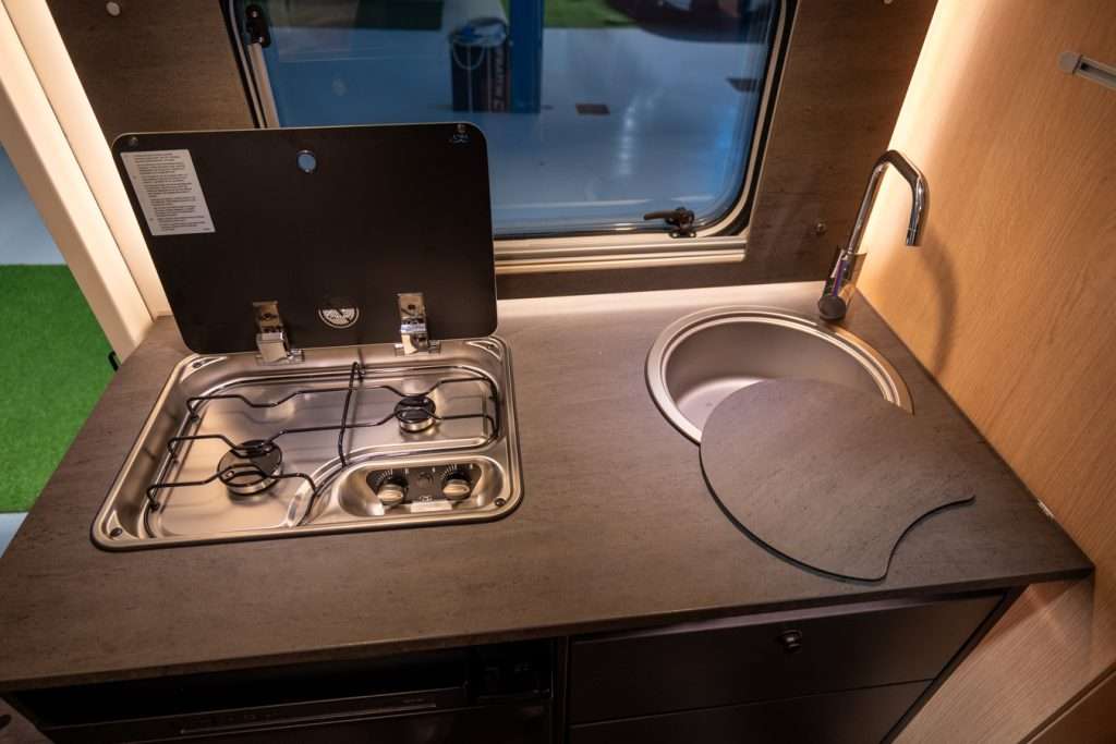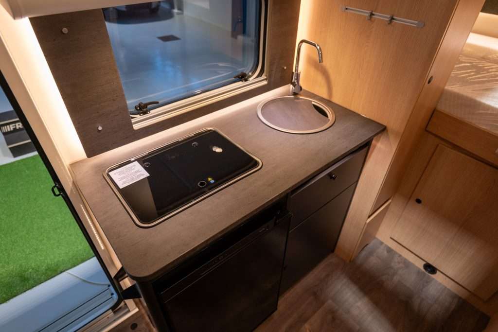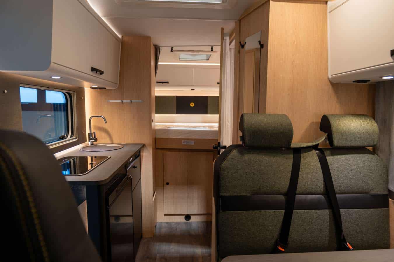 <p>La cucina in linea è compatta ma completa, con frigorifero da 78 litri che mantiene freschi i vostri alimenti durante il viaggio. Qui potrete preparare colazioni abbondanti e cene gustose, trasformando ogni meta in un'occasione culinaria. Il bagno con doccia rappresenta il vostro benessere personale: uno spazio funzionale dove iniziare e concludere la giornata con serenità. La zona notte posteriore con letto trasversale (210 x 140-130 cm) completa l'offerta di comfort, ideale per i bambini o per chi preferisce una posizione diversa durante il riposo.</p><br />