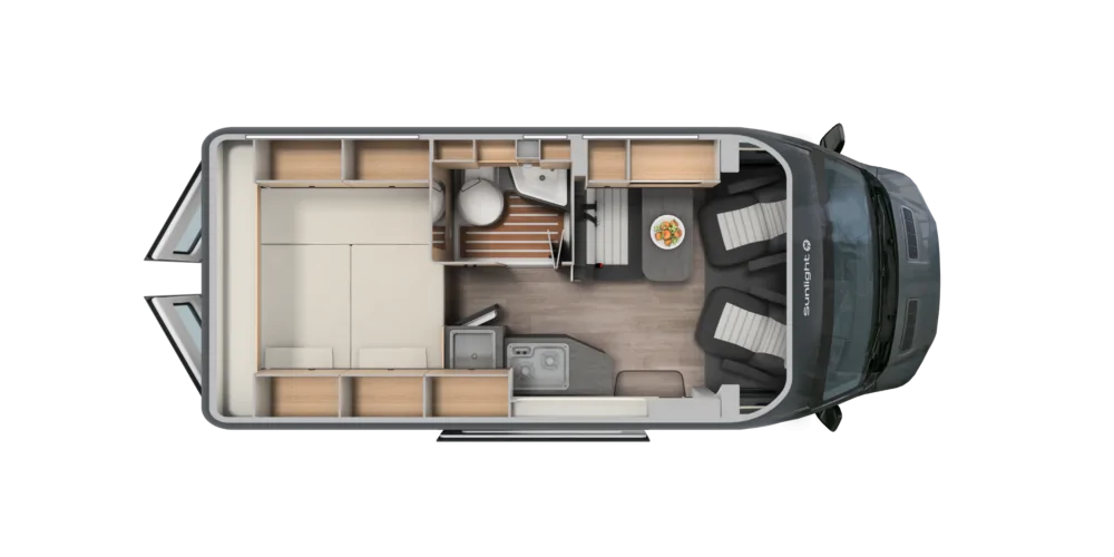 All’interno, il Cliff 4×4 è il tuo campo base perfetto. Il layout intelligente massimizza lo spazio, offrendo un comodo letto trasversale per ricaricare le energie e ampi vani per la tua attrezzatura sportiva. La cucina funzionale e il bagno ben organizzato ti garantiscono tutto il comfort necessario dopo una giornata di esplorazione. La solida costruzione tedesca e il design dinamico lo rendono un rifugio affidabile e di carattere.